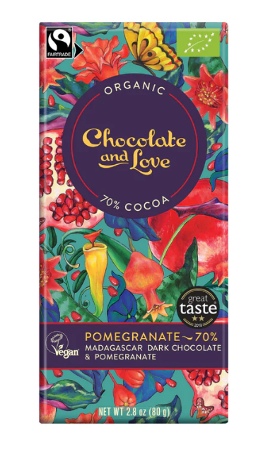 Innihald: Kakómassi*, reyrsykur*, kakósmjör*, granateplamauk* 9% (granatepli*, eplasafaþykkni*, hrísgrjónamjöl*, þykkingarefni*[pektín*]), vanillustönglar*. *Lífrænt vottað. Kakó, sykur, vanilla eru Fairtrade vottuð, viðskipti ásamt eftirfylgni fengin frá Fairtrade framleiðendum.