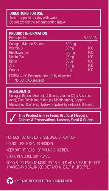 Hvert hylki inniheldur 500mg af hydrolýseruðu marine II kollageni.