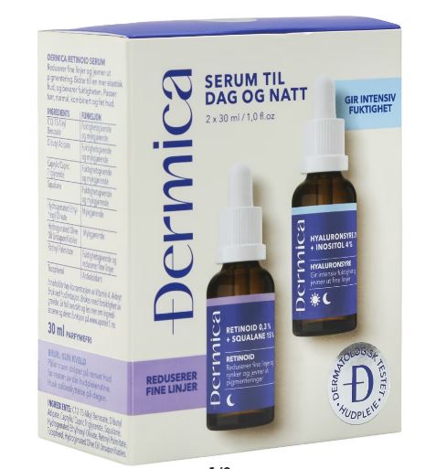 Dermica Retinoid serum: C12-15 Alkyl Benzoate (fuktighetsgivende og mykgjørende), Dibutyl Adipate (fuktighetsgivende og mykgjørende), Caprylic/Capric Triglyceride (fuktighetsgivende og mykgjørende), Squalane (fuktighetsgivende og mykgjørende), Hydrogenated Ethylhexyl Olivate (mykgjørende), Retinyl Palmitate (fuktighetsgivende og reduserer fine linjer (Retinoid), Tocopherol (antioksidant), Hydrogenated Olive Oil Unsaponifiables (mykgjørende). Dermica Hyaluronsyre serum: Aqua (konsistensgiver), Inositol (fuktighetsgivende), Glycerin (fuktighetsgivende), Propanediol (fuktighetsgivende), Sodium Hyaluronate (intensiv fuktighetsgiver), Hydrolyzed Hyaluronic Acid (fuktighetsgivende), Sodium PCA (fuktighetsgivende), Tetrasodium Iminodisuccinate (konsistensgiver), Citric Acid (pH-regulator), Sodium Hydroxide (pH-regulator), Ethylhexylglycerin (fuktighetsgivende), Phenoxyethanol (konservering).