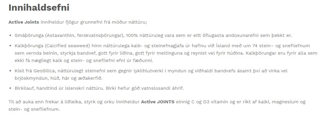 Active JOINTS inniheldur uppbyggjandi næringarefni með margra ára rannsóknir að baki sem sýna fram á virkni fyrir heilsu beina, liða- og tanna. Það hefur áhrif á auma og bólgna liði, eykur sveigjanleika í liðum, styrkir bein og eykur orku ásamt því að húð, neglur og hár njóta góðs af. Við vöndum til verka og sækjum í sjálfbærar auðlindir úr sjó og landi. Við notum hreina íslenska náttúruafurð, náttúruleg og hrein hráefni sem ekki eru erfðabreytt og stuðla að sveigjanlegri liðum, því með sveigjanlegri líkama erum við færari á að takast á við verkefnin í dagsins önn.