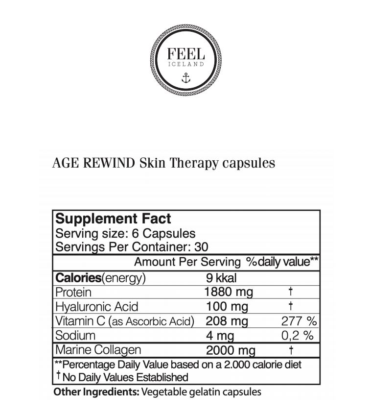 Age Rewind Skin Therapy inniheldur Hyaluronic sýru sem gegnir lykilhlutverki í líkamanum hvað varðar raka húðarinnar. Með aldrinum minnkar hún í líkamanum og því fer að bera á hrukkum og skorti á raka. Með því að taka hana inn getur líkaminn nýtt sér hana mjög vel og það skilar sér í bættri ásýnd húðarinnar.