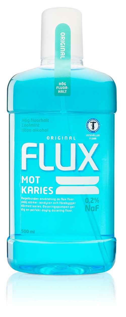 Flux Orginal flúormunnskol inniheldur hátt flúorinnihald og regluleg notkun þess styrkir tennur og verkar fyrirbyggjandi gegn tannskemmdum.