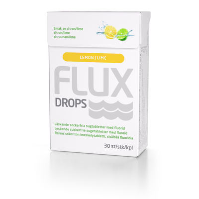 Flux drops eru frískandi munsogstöflur sem örva munnvatnsframleiðslu. Töflurnar valda ekki glerungseyðingu og innihalda flúor.