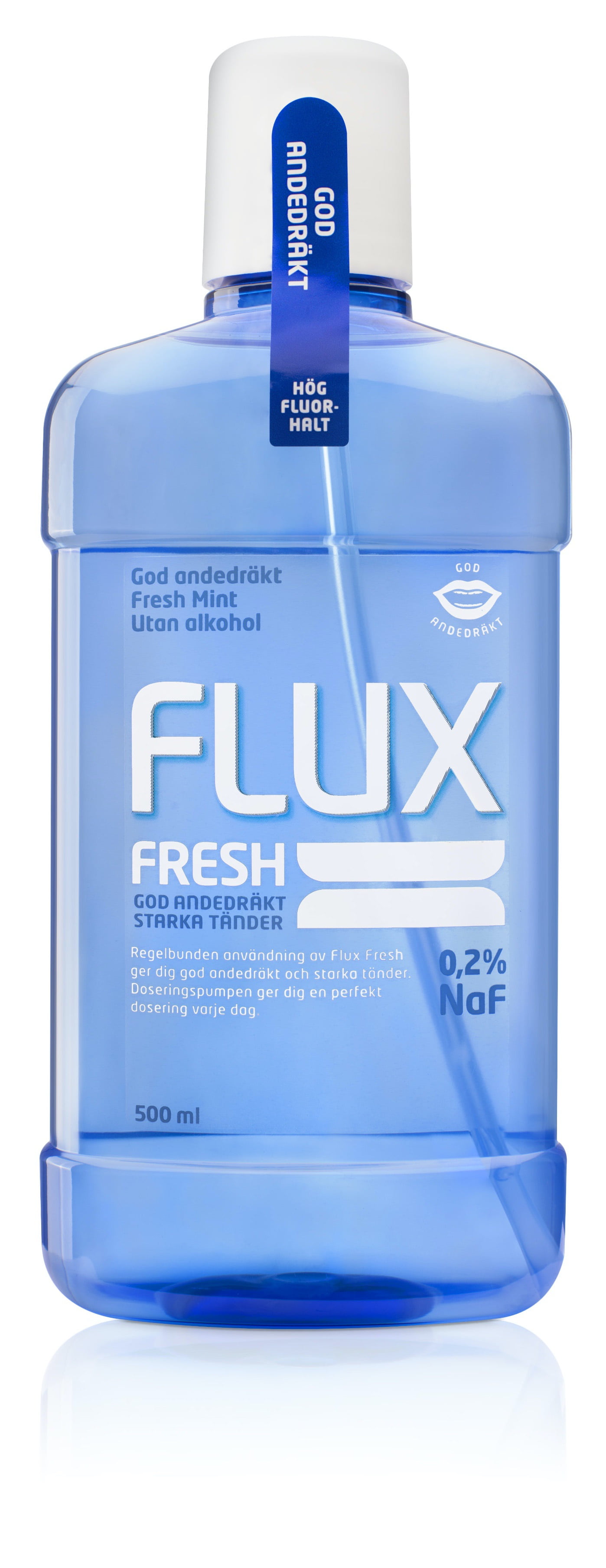 Flux Fresh flúormunnskol hefur tvöfalda virkni, það gefur bæði ferskan andardrátt og er með háu flúorinnihaldi. Styrkir glerunginn þannig að hann brotnar síður niður og núverandi tannskemmdir breiðast hægar út eða ganga til baka. Flux Fresh er með skammtastút sem hjálpar við rétta skömmtun.