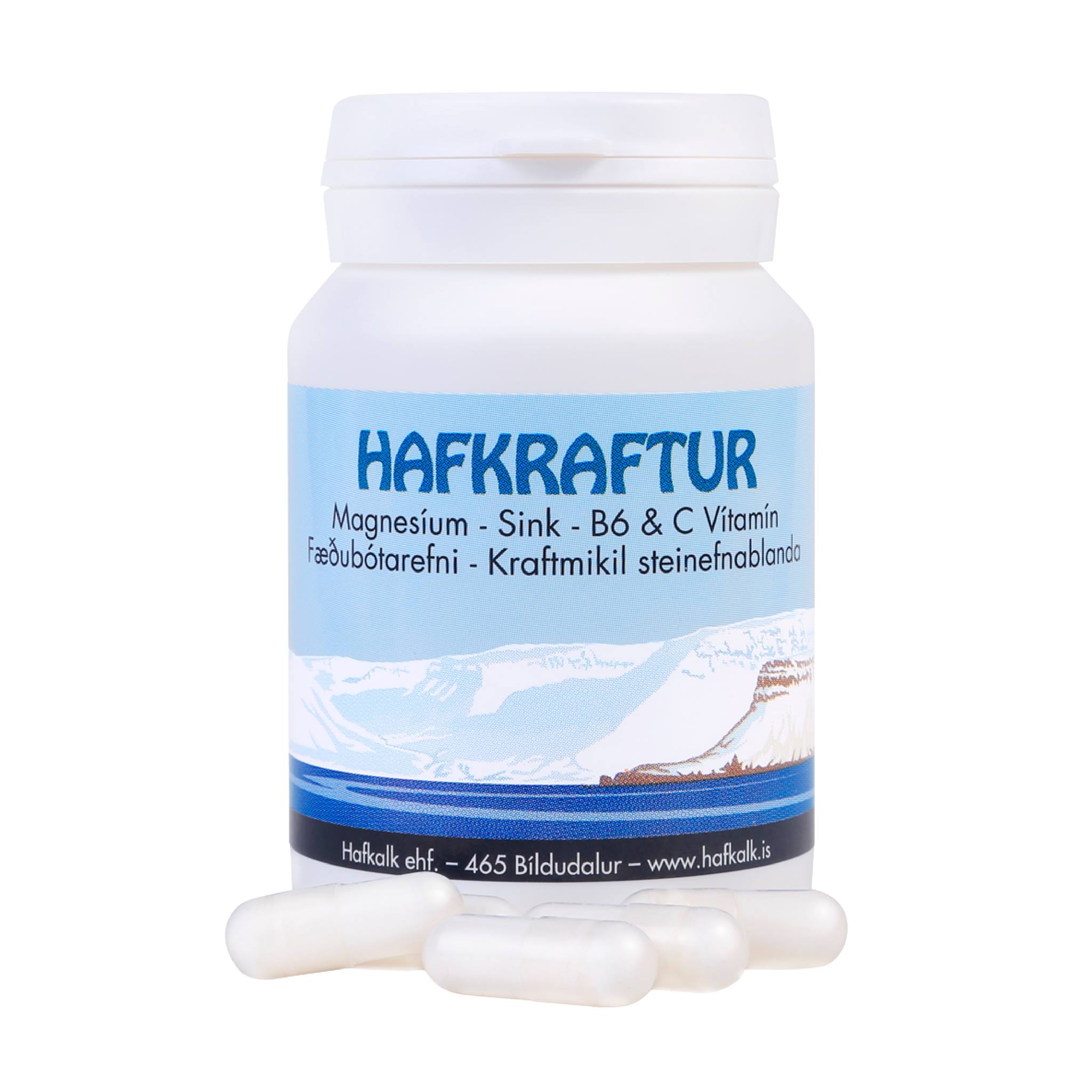 Kraftmikil steinefnablanda án aukaefna. Gegn þreytu og orkuleysi. Inniheldur náttúrulegt magnesíum extrakt unnið úr sjó og Sink-L-Aspartate sem er auðmelt og kraftmikið sink, bundið amínósýrunni L-Aspartate. Hafkraftur inniheldur einnig öflugan skammt af virku B6 vítamíni sem virkar án umbreytingar í lifur auk C vítamíns sem styður við virkni efnanna.