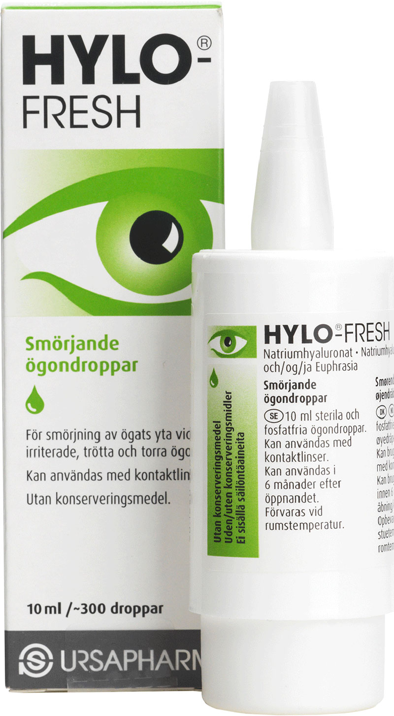 HYLO®-FRESH frískar upp augu, linar óþægindi og smyr, ert, sár og þreytt augu, vegna augnþurrks. Fyrir þá sem finna stundum fyrir óþægindum t.d. við notkun á linsum, fyrst á morgnanna eða eftir margra tíma stöðuga tölvuvinnu. 0,3mg/ml Hyaluronsýra