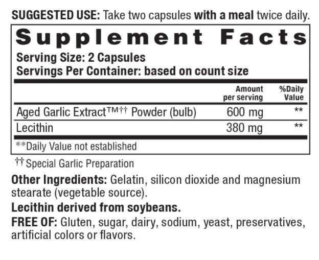Kyolic með Lecithin inniheldur 100% lífrænan hvítlauk og lecithin sem styður við eðlileg kólesteról gildi, heilbrigt hjarta-og æðakerfi.