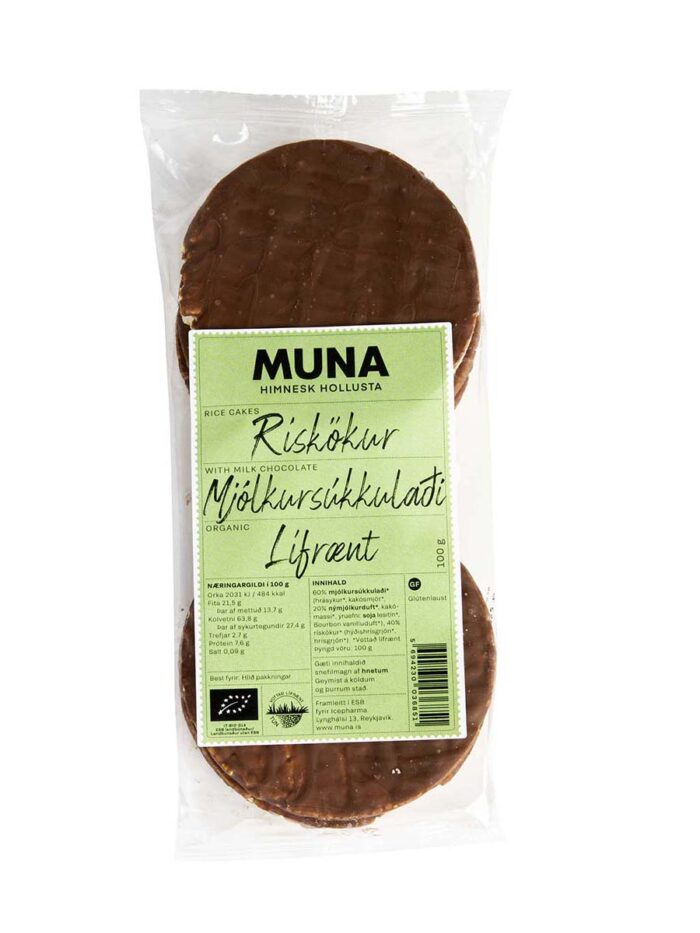 60% mjólkursúkkulaði* ( hrásykur*, kakósmjör*, 20% nýmjólkurduft*, kakómassi*, ýruefni: soja lesitín*, Bourbon vanilluduft*), 40% rískökur* (rískökur*(hýðishrísgrjón*, hrísgrjón*). *Vottað lífrænt