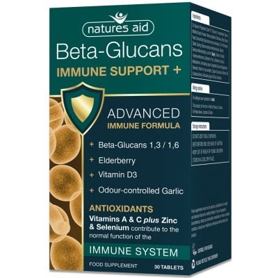Beta Glucan Immune support+ er háþróað bætiefni frá Natures Aid sem inniheldur afar öfluga blöndu af jurtum, vítamínum og steinefnum sem hafa það að markmiði að efla ónæmiskerfi líkamans.