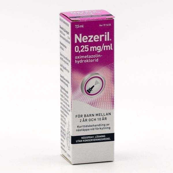 Ráðlagður skammtur er: Nefdropar 0,25 mg/ml: Börn 2-7 ára: 2 dropar í hvora nös 2-3 sinnum á sólarhring. Börn 7-10 ára: 1 stakskammtaílát tæmt í hvora nös 2-3 sinnum á sólarhring. Nefdropar 0,5 mg/ml: Fullorðnir og börn eldri en 10 ára: 1 stakskammtaílát tæmt í hvora nös 2-3 sinnum á sólarhring. Ekki má nota Nezeril í fleiri en 10 daga samfleytt. Við notkun í lengri tíma getur Nezeril valdið nefstíflu
