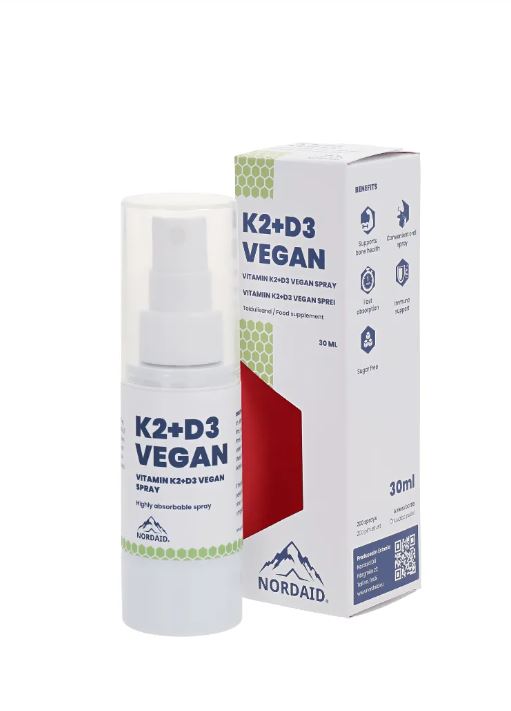4 úðar á dag gefa 100 μg af K2-vítamíni (133%) og 100 μg (4000 IU) (2000%*) af vegan D3- vítamíni úr grákrókum