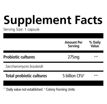 Inniheldur 5 milljarða af vinveittum bakteríum: Saccharomyces boulardii 250mg. Vegan hylki (grænmetishylki).