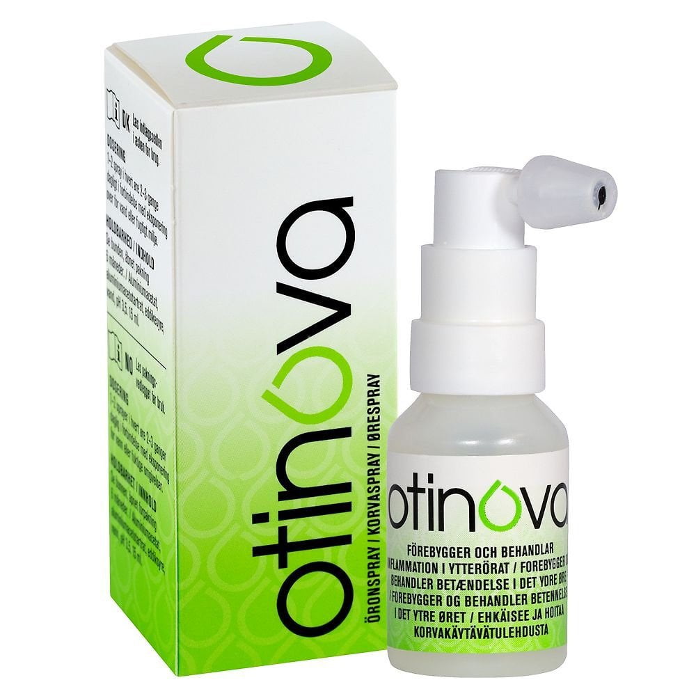 Otinova þurrkar upp vökva í eyrnagöngum, slær á kláða og hefur sýkla- og sveppadrepandi verkun. Ekki ráðlagt að nota Otinova í börnum með rör eða ef grunur leikur á rofi á hljóðhimnu. Ekki skal nota Otinova hjá börnum yngri en 5 ára. Otinova eyrnaúðinn inniheldur ediksýru og ál asetat sem spila vel saman í vörn gegn eyrnabólgu.