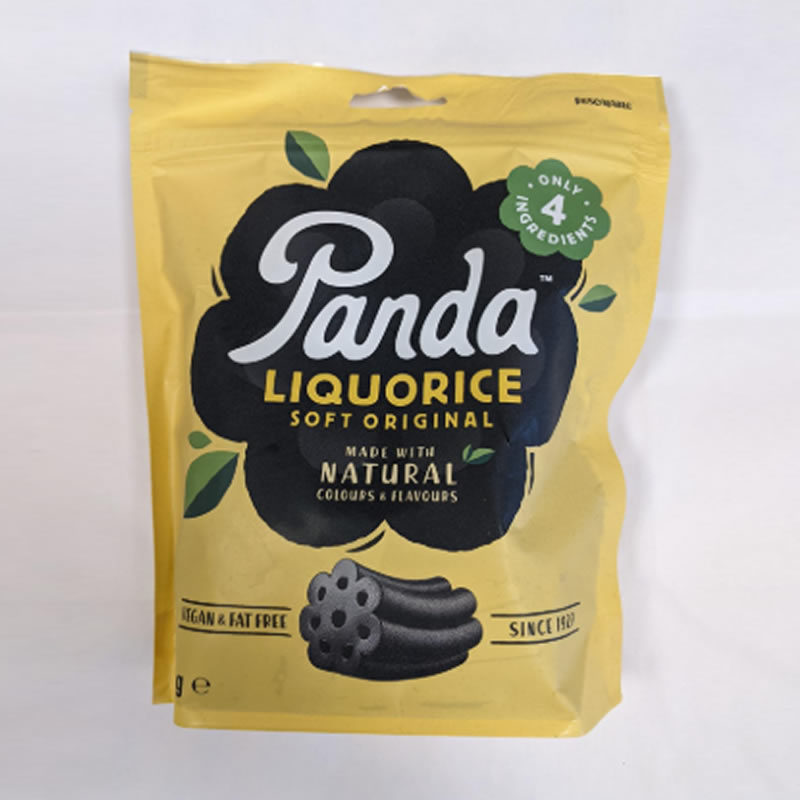 Panda er vegan og vegeterian lakkrís. 100% náttúrulegur lakkrís. Hreinn mjúkur gæða hrá lakkrís. Öll innihaldsefni náttúrulega. Enginn viðbætt litarefni. Ekkert viðbætt salt. Engin tilbúin bragðefni. engin rotvarnarefni. 99% fitu frír.