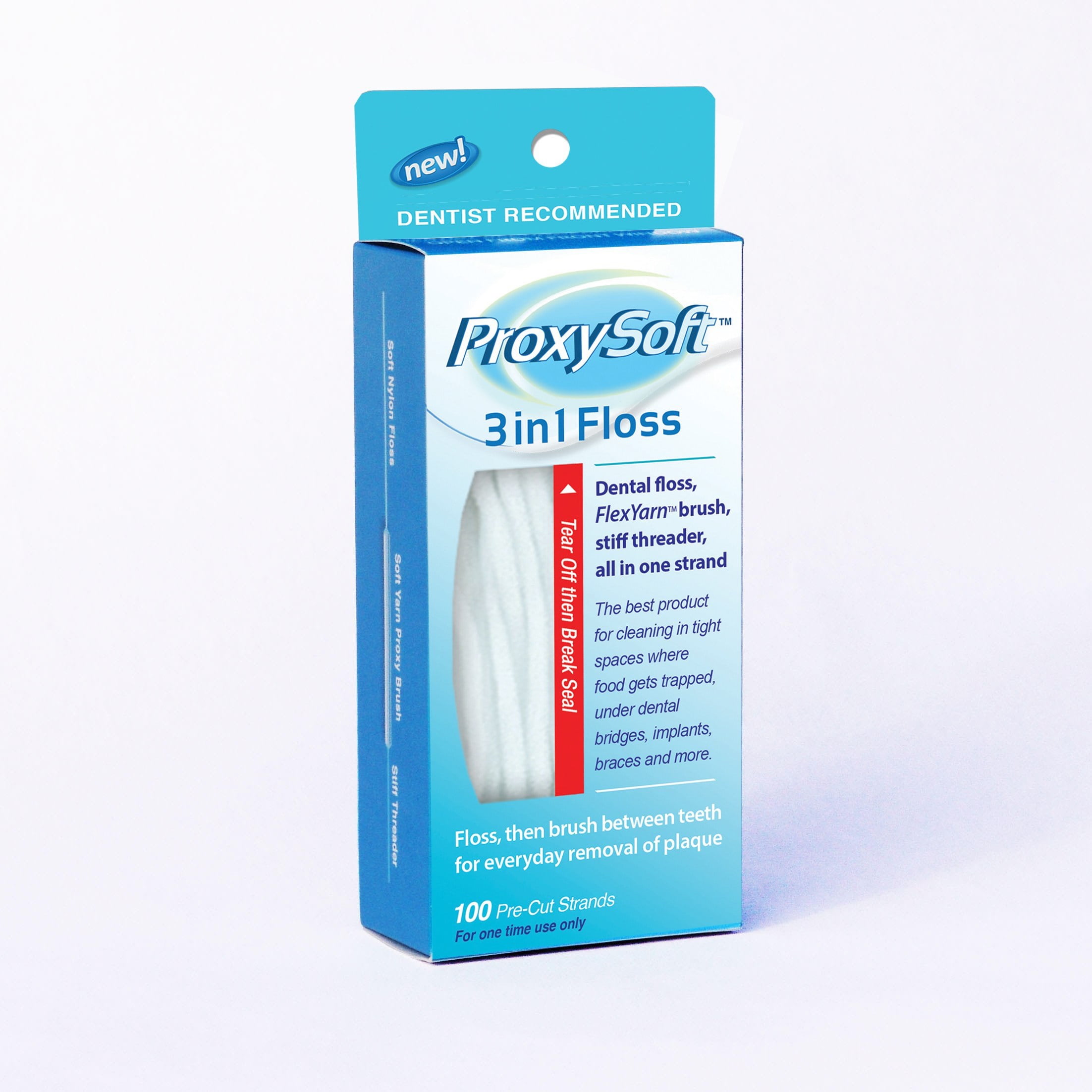 Proxy Soft er þráður sem nær til og hreinsar þröng svæði. Tilvalinn til notkunar á þau svæði sem erfitt er að nálgast með tannbursta t.d. milli tannanna, kringum tannplanta, nálægt spöngum og undir víra. Proxy Soft 3 in 1 Floss er þrískiptur þráður: tannþráður, mjúkur Proxy bursti og stífur þráður.