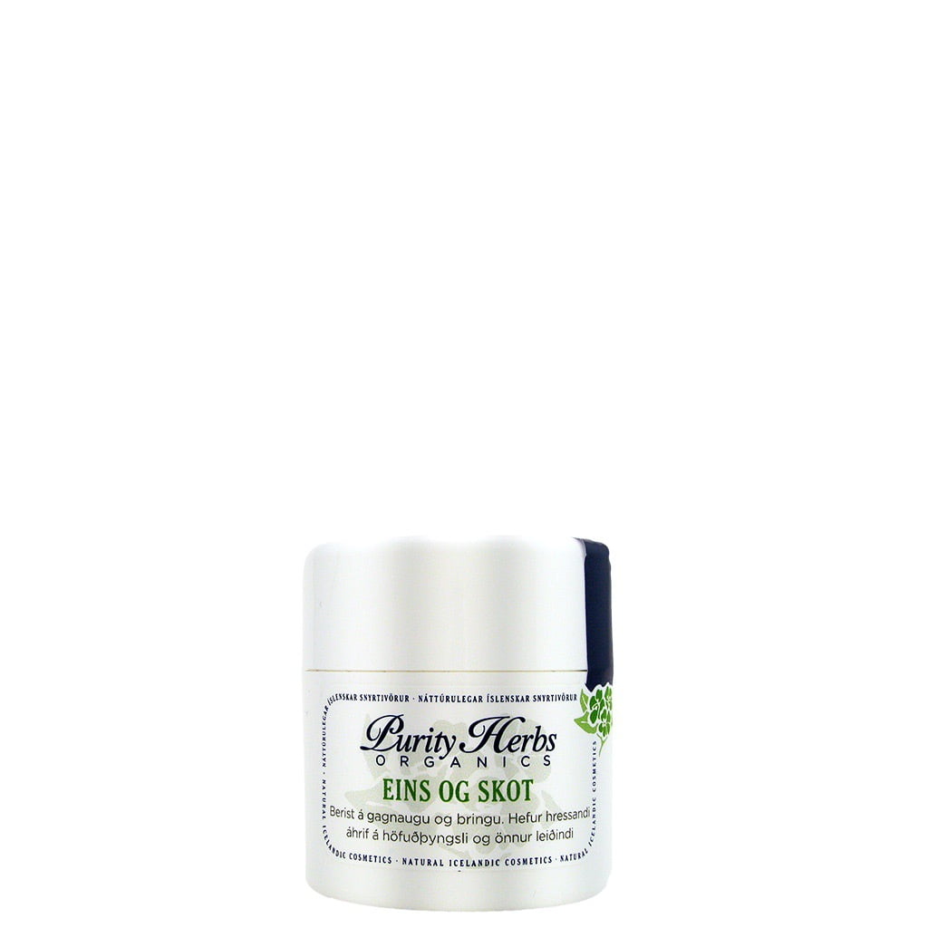 Aqua (Water), Prunus Amygdalus Dulcis (Sweet Almond) Oil, Cetearyl Glucoside, Cera Alba (Beeswax), Glycerin, Simmondsia Chinensis (Jojoba) Seed Oil∆, Butyrospermum Parkii (Shea) Butter, Squalane, Glucose, Calendula Officinalis Flower oil∆, Cinnamomum Camphora (Camphor) Leaf Oil, Mentha Piperita (Peppermint) Oil, Triticum Vulgare (Wheat) Germ Oil, Lavandula Angustifolia (Lavender) Oil∆, Gaultheria Procumbens (Wintergreen) Leaf Oil∆, Xanthan Gum, Sodium Citrate, Pinus Sylvestris Leaf Oil∆, Eucalyptus Globulus Leaf Oil∆, Juniperus Communis Fruit Oil∆, Myristica Fragrans (Nutmeg) Kernel Oil∆, Pimpinella Anisum (Anise) Fruit Oil, Spiraea Ulmaria (Meadowsweet) Extract*, Thymus Praecox Extract*, Juniperus Communis Fruit Extract*, Glucose Oxidase, Carum Carvi (Caraway) Seed Extract, Lactobacillus, Achillea Millefolium Flower Extract*, Equisetum Arvense Extract*, Lavandula Angustifolia (Lavender) Flower Extract, Salix Alba (Willow) Bark Extract*, Symphytum Officinale Root Extract, Cocos Nucifera (Coconut) Fruit Extract, Capsicum Frutescens Resin, Citric Acid, Lactoperoxidase, Geraniol**, Limonene**, Linalool**. ∆ Lífrænt vottað * Villtar íslenskar jurtir **Úr náttúrulegum ilmkjarnaolíum Ekki prófað á dýrum.