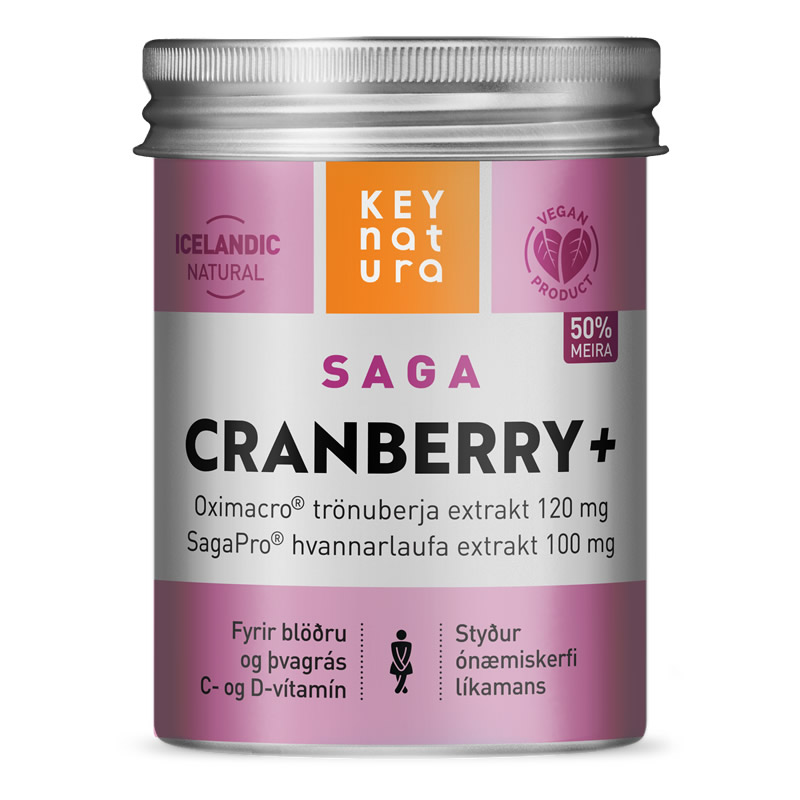 SagaPro 100 mg – SagaPro slakar á vöðvum í þvagblöðru og getur því hentað fyrir konur með ofvirka blöðru Oximacro 120 mg – 120 mg af Oximacro innihalda 36 mg af PAC-A (próanþósýanídín-A) sem er klínískt rannsakað og virkar vel fyrir konur með þvagfærasýkingu C-vítamín 160 mg (200% NV) – Styður ónæmiskerfi líkamans D-vítamín 10 µg (200% NV) – Styður ónæmiskerfi líkamans