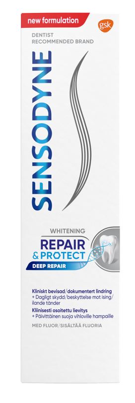 Sensodyne Repair & Protect Whitening tannkremið er fyrir viðkvæm svæði. Tannkremið verndar gegn tannkuli sé það notað tvisvar á dag.