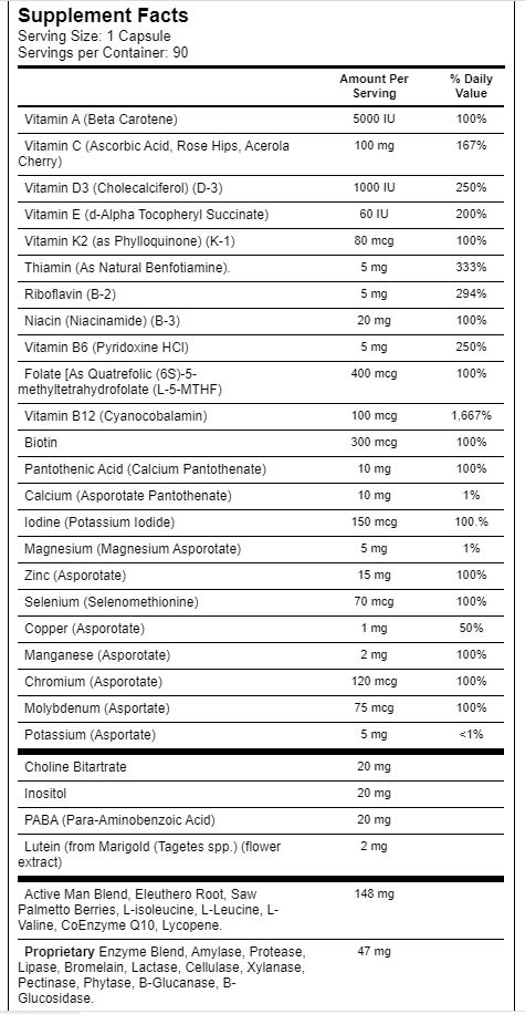Alhliða fjölvítamín fyrir karlmenn. Öll helstu vítamín og steinefni. Góð form og góð upptaka. Járnlaust. Fullur dagsskammtur af sinki. Orkugefandi jurtir og amínósýrur. Andoxunarefni og ensím. Jurtablanda með graskersfræjum sem eru mjög rík af sinki.