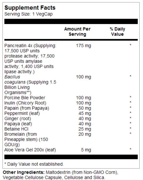 Bætir meltinguna. Solaray Super Digestive+Probiotics. Plöntu baseruð ensímblanda með breiðu PH gildi sem er gerð til að styrkja og bæta meltingu og niðurbrot á fæðu í meltingarveginum. Blandan inniheldur Bacillus coagulans góðgerla.