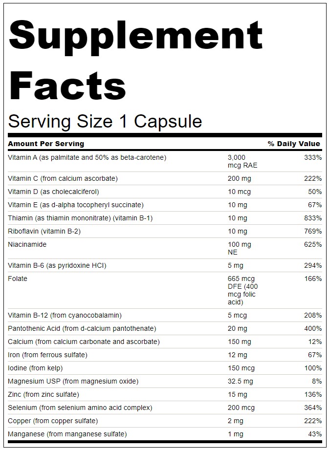 ATH! Þetta fjölvítamín inniheldur 100 mg af Níasíni. Það er algeng aukaverkun Níasíns að fá roðaviðbrögð eða á ensku kallað “flush”. Það getur valdið sviða, kláða og roða í andliti, handleggjum og brjósti, auk höfuðverks.