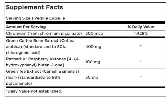 Swanson Green Coffee Complex, er blanda af grænu kaffibaunaextrakti, króm Píkólínat, hindberja ketónum (Rasberry Ketones) og grænu tei.