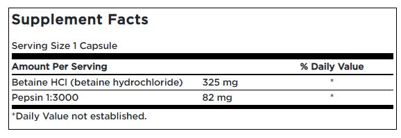 - Hvert þessara handhægu hylkja inniheldur 325 mg af betaín HCI og 82 mg af pepsíni