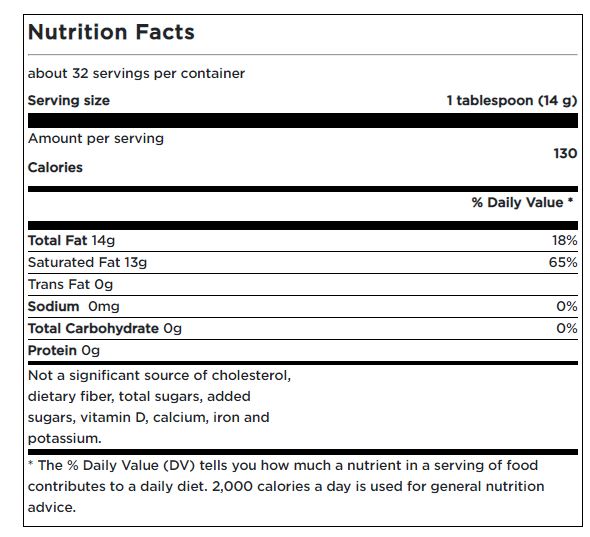 Ingredients: Certified 100% organic extra virgin coconut oil (cold-pressed).
