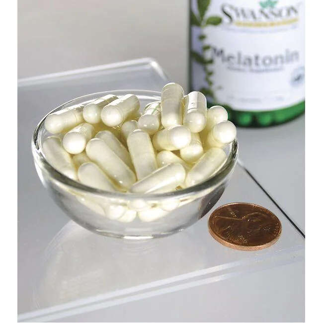 Melatonin hylkin frá Swanson innihalda 1mg af Melatonin, 120 hylki í einu glasi.